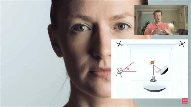 Để tránh hai lỗi này chúng ta có thể đặt nguồn sáng chính theo nguyên tắc 45-45-45. Đó chính là đặt nguồn sáng hướng xuống chủ thể theo góc 45 độ. Máy ảnh và nguồn sáng chính cũng hợp thành một góc 45 độ ở vị trí của chủ thể.